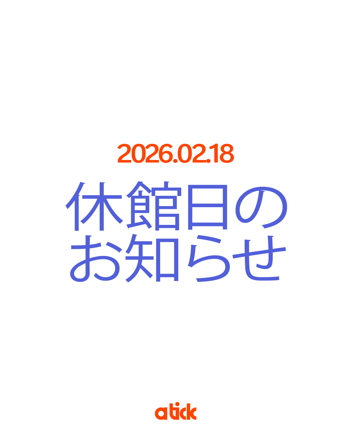 2/18 休館日のお知らせ 2026 1/21 INFO 2026年 2月 18日(水)は atick棚卸作業のため休館日となります。ご来店予定の方にはご不便をおかけいたします。 上記日程以外は、年中無休で営業しておりますので皆さまのご来店を心よりお待ちしております! INFO 共有はこちら 【ドッグラン】雪の中で全力疾走! 【12/13~2/15】 WATANABE PILE (今治タオル) 関連記事 セールアイテムがさらにお得に! 2026年1月9日 新年のご挨拶 2026年1月4日 【年末年始の営業につきまして】 2025年12月29日 エントランスにツリーが登場! 2025年11月27日 EVENT Info 2025/11 2025年11月3日 ゆるアジアンハロウィン 2025年10月20日 GOOD SOUND COFFEE 9月の新メニュー 2025年9月4日 舞鶴プレミアム商品券2025がお使いいただけます 2025年9月4日